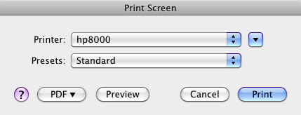 To print the current contents of the screen, select Print Screen from the File menu, or type ⌘P. If Printer 1 is set to File, the file will be written to immediately, with no visual indicator. If Printer 1 is set to Printer, the Print Screen dialog opens.